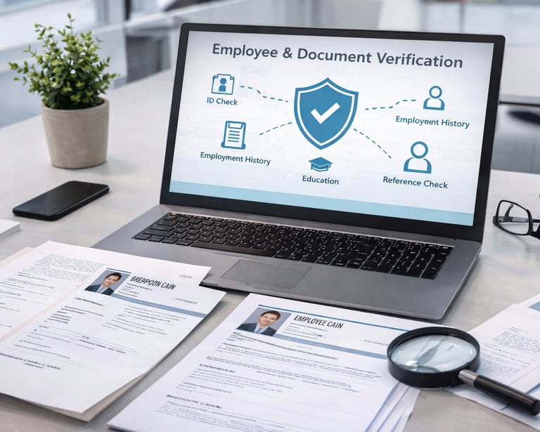 Verification services covering identity, employment history, professional certifications, academic credentials, and reference checks, supporting recruitment integrity, compliance obligations, and internal risk management processes.