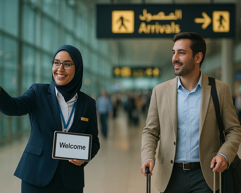 Professional airport meet-and-greet services for corporate travelers, supporting secure, efficient, and discreet airport movement in alignment with corporate security protocols and duty-of-care requirements.